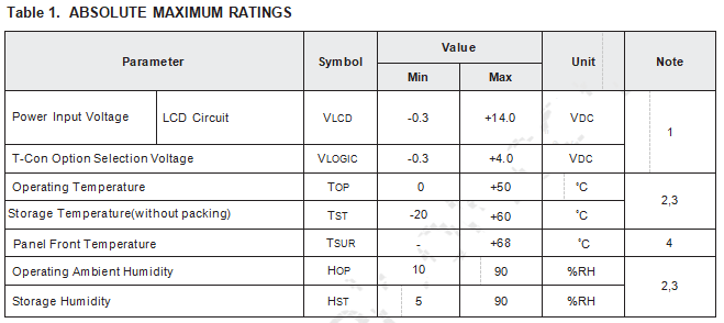 The following items are maximum values which, if exceeded, may cause faulty operation or permanent damage to the LCD module.