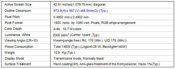 The HY0430GL02 is a Color Active Matrix Liquid Crystal Display with an integral the Source PCB and Gate implanted on Panel (GIP) . The matrix employs a-Si Thin Film Transistor as the active element. It is a transmissive type display operating in the normally black mode. It has a 43.0 inch diagonally measured active display area with W UXGA resolution (1080 vertical by 1920 horizontal pixel array) . Each pixel is divided into Red, Green and Blue sub-pixels or dots which are arranged in vertical stripes. Gray scale or the luminance of the sub-pixel color is determined with a 8-bit gray scale signal for each dot. Therefore, it can present a palette of more than 16.7M(true) colors.