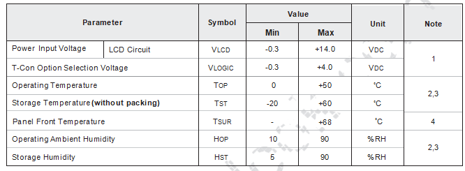 The following items are maximum values which, if exceeded, may cause faulty operation or permanent damage to the LCD module.