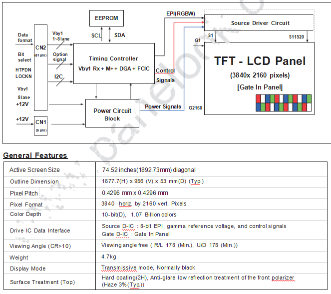 It is a transmissive type display operating in the normally black mode. It has a 74.52 inch diagonally measuredactive display area with QWUXGA resolution (2160 vertical by 3840 horizontal pixel array).